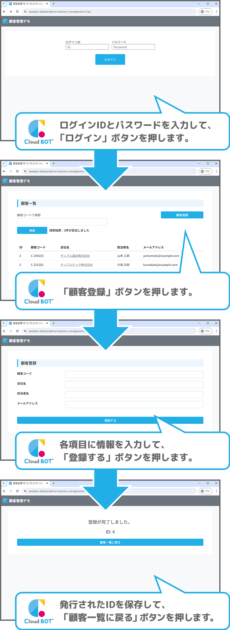 「ログイン」>「顧客登録ボタンをクリック」>「情報を入力」>「入力確認」>「登録完了」