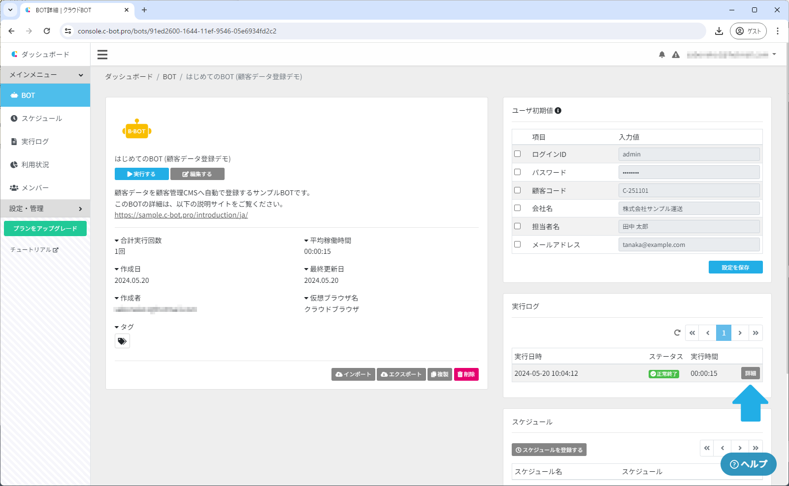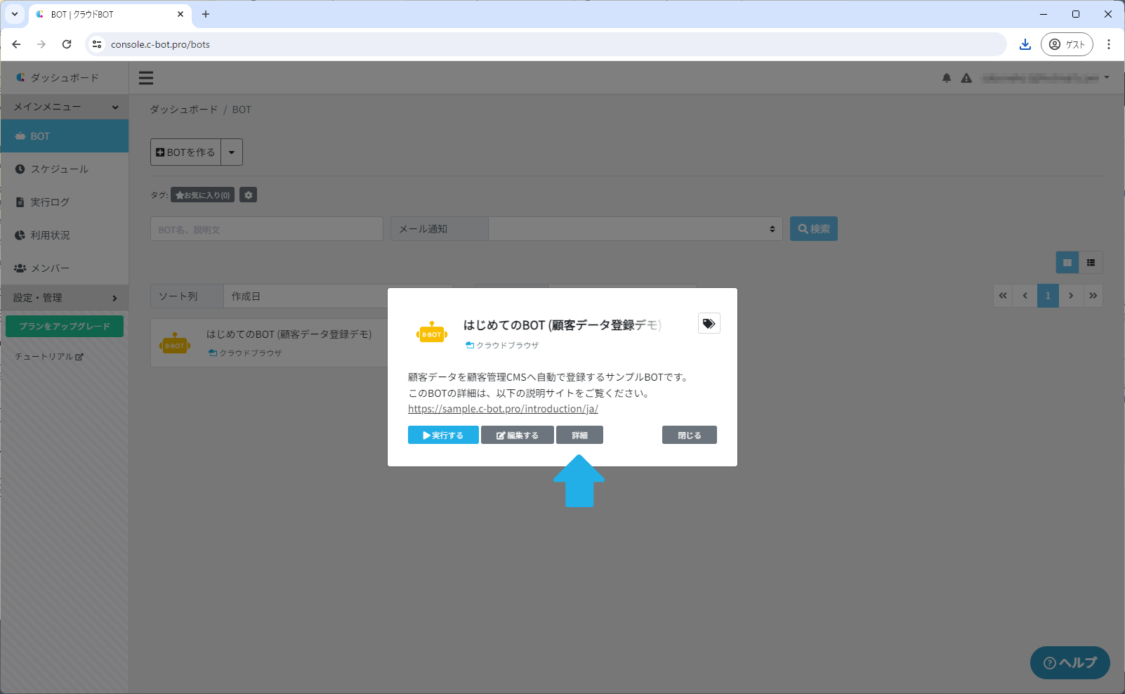 詳細ボタンが表示されていない場合は「はじめてのBOT (顧客データ登録デモ)」をクリックすると表示されます。