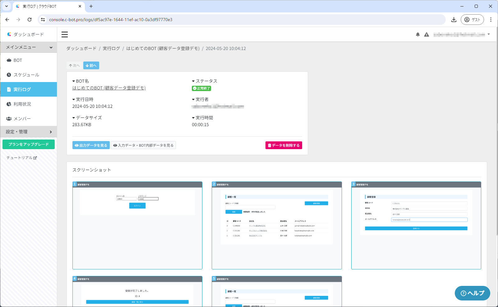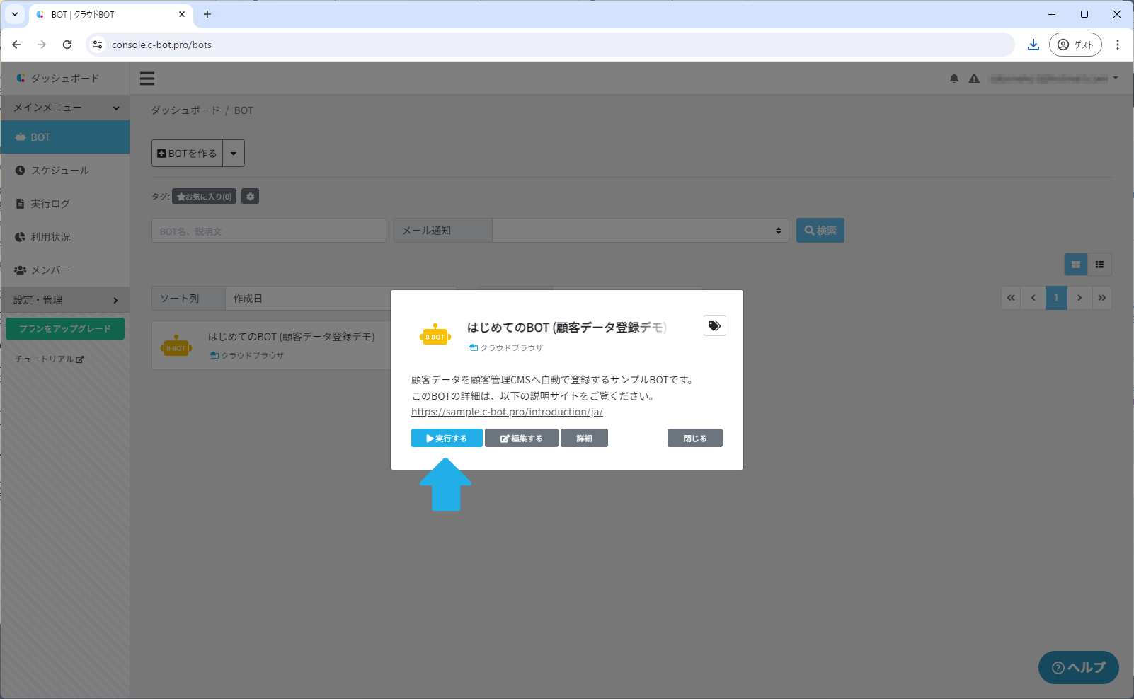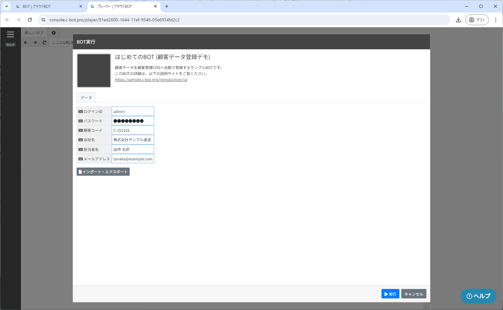 ①「はじめてのBOT (顧客データ登録デモ)」をクリックし、「実行する」ボタンをクリックします。